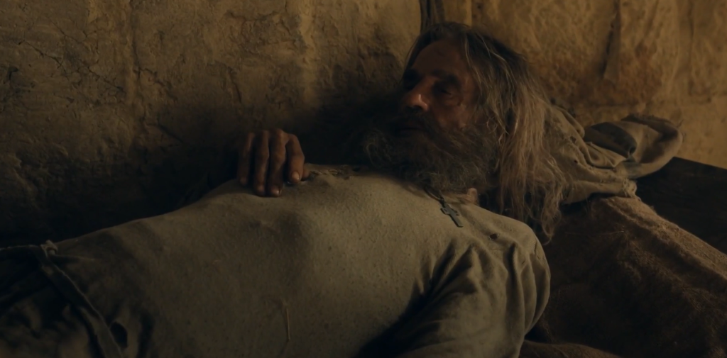 And it does happen, only a few months later. Faria has another attack. Before his death, he tells Dantès about a hidden treasure on the island of Monte Cristo, shows him the map, and then… he dies. Dantès tries to save him, but there is nothing he can do. He can only watch Faria — his teacher, his father, his friend, his everything — take his last breath.